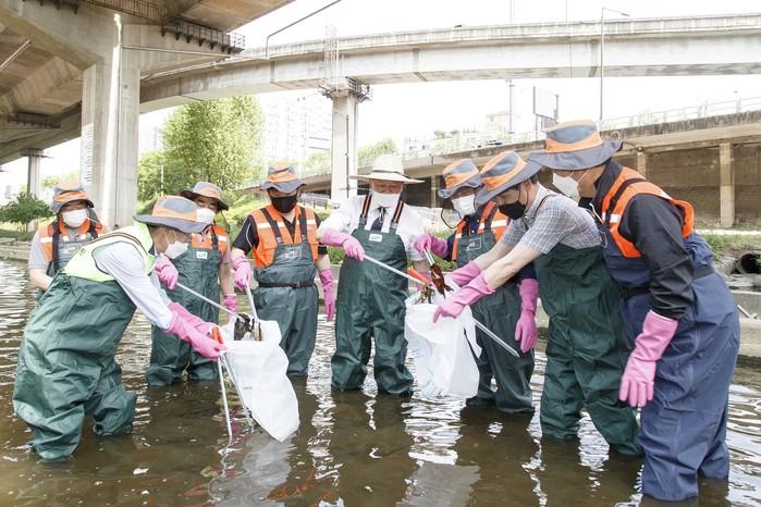 서울 마포구는 최근 홍제천에서 2021년 ‘마포 하천정화활동 추진단’ 발대식을 개최해 하천정화활동을 전개하고 하천정화활동 추진단에 활동 교육을 진행했다. 사진은 유동균 구청장(가운데)이 마포 하천정화활동 추진단과 함께 하천 정비를 하고 있는 모습. (사진제공=마포구청)