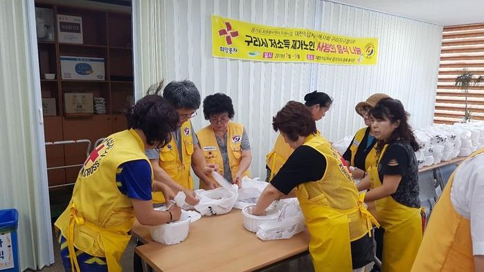 경기 구리시는 최근 대한적십자사봉사회 구리지구협의회 주관으로 대한적십자사 경기도지사 동북봉사관에서 희망풍차 결연 가구와 홀몸노인들에게 삼계탕을 끓여 나눔하는 행사를 개최했다. 행사는 오는 9월까지 진행된다. 사진은 삼계탕을 포장하는 모습. (사진제공=구리시청)