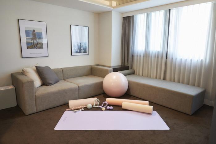 안다르x글래드 스페셜 객실 패키지는 호텔 객실 1박과 함께 안다르 홈트 용품을 무상으로 제공한다.