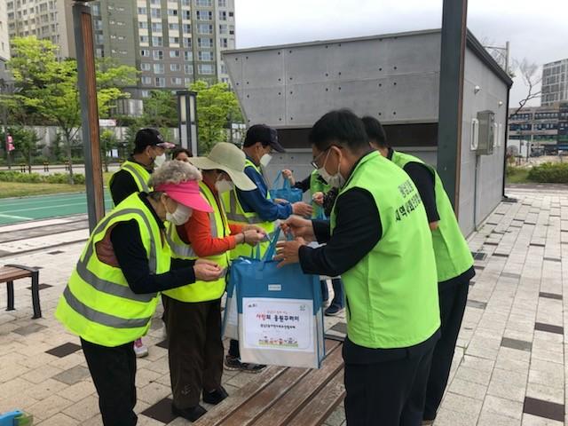 경기 광주시 광남2동 지역사회보장협의체는 지난 5월31일 지역내 노인일자리 사업 참여노인 20명에게 ‘사랑의 응원꾸러미’를 전달하며 응원했다. 꾸러미는 비타민D·견과·마스크 등 건강 증진과 코로나19 방역을 위해 맞춤형으로 구성됐다. 사진은 응원꾸러미를 전달하고 있는 모습. (사진제공=광주시청)