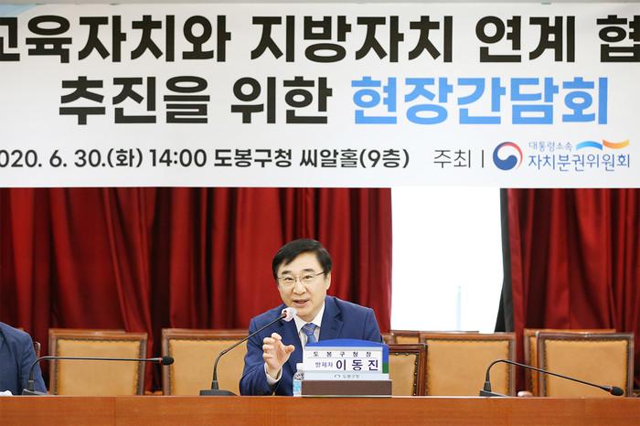 서울 도봉구는 최근 대통령소속 자치분권위원회와 공동으로 ‘교육자치와 지방자치 연계·협력 활성화를 위한 현장 간담회’를 개최했다. 간담회에서는 교육자치와 지방자치 영역이 협력해 지역현장의 우수사례 발굴과 확산 방안을 모색했다. 사진은 이동진 구청장이 교육자치와 지방자치 연계협력 방안에 대해 발언하고 있는 모습. (사진제공=도봉구청)