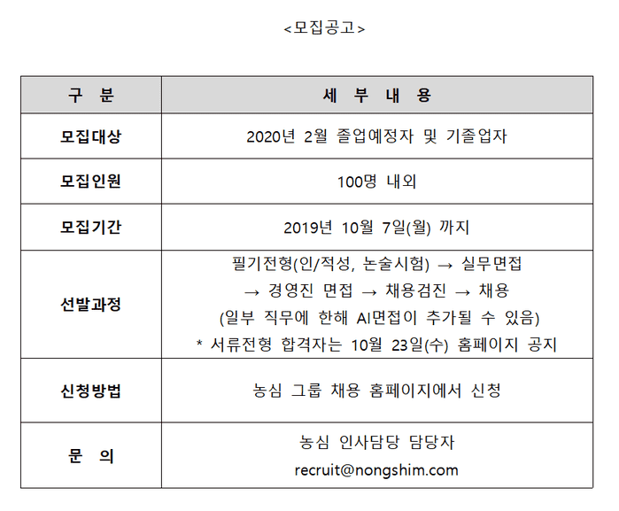 서류전형 합격자는 10월 23일 오후에 발표 예정이며, 이후 필기전형(적성검사, 인성검사, 논술시험) → 실무 면접 → 경영진 면접 → 채용검진을 거쳐 2020년 1월 중 최종 입사하게 된다. 특히 올해는 일부 직무에 한해 AI 면접을 추가함으로써 객관적으로 직무적합도를 평가해 농심이 원하는 인재를 발굴할 예정이다.