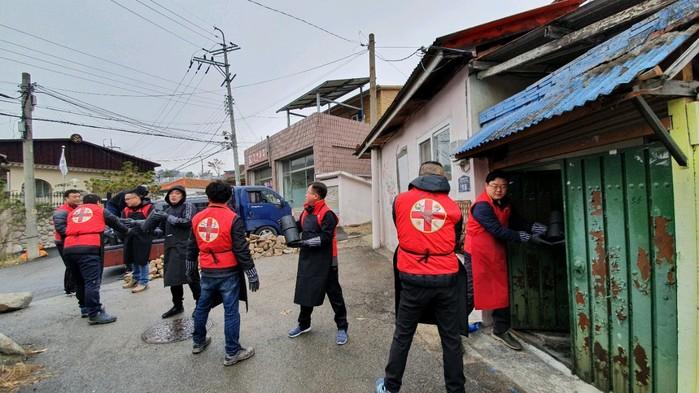 1일 경기 동두천시에 천우회가 방문해 저소득 소외계층을 대상으로 연탄 1500장과 라면 40상자를 후원, 전달했다. 천우회는 연천, 동두천 소띠 주민들의 모임이다. 사진은 회원들이 저소득 소외계층 가구에 방문해 연탄을 나르고 있는 모습. (사진제공=동두천시청)