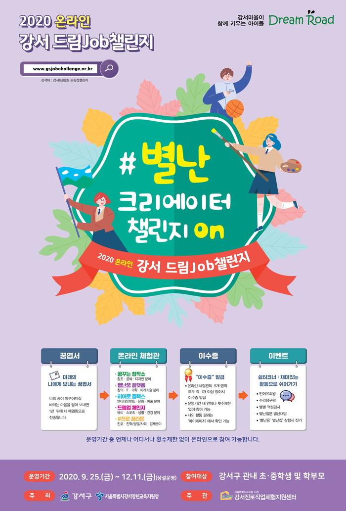 [시민일보 = 홍덕표 기자] 서울 강서구(구청장 노현송)는 지역 중학생과 초등학생들의 직업 체험을 도와 다양한 진로를 탐색할 수 있도록 '2020 온라인 강서 드림Job 챌린지'를 개최한다고 24일 밝혔다.
