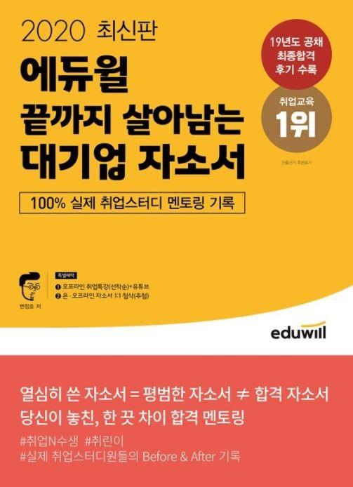 [시민일보 = 여영준 기자] 종합교육기업 에듀윌(대표 박명규)은 대기업 채용 대비 자기소개서 교재 ‘2020 최신판 에듀윌 끝까지 살아남는 대기업 자소서’를 새로 발간했다고 7일 밝혔다.