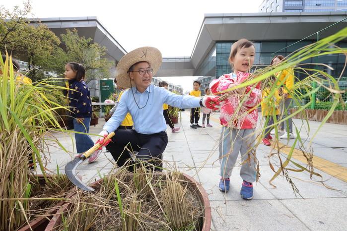 서울 금천구가 24일 구청 보건소 앞마당에서 어린이집 원생, 학부모 200여명과 도심속 ‘가을걷이’ 체험 행사를 진행했다. 사진은 가을걷이 행사에서 유성훈 구청장이 어린이집 원생에게 수확한 벼를 전해 주고 있는 모습.(사진제공=금천구청)