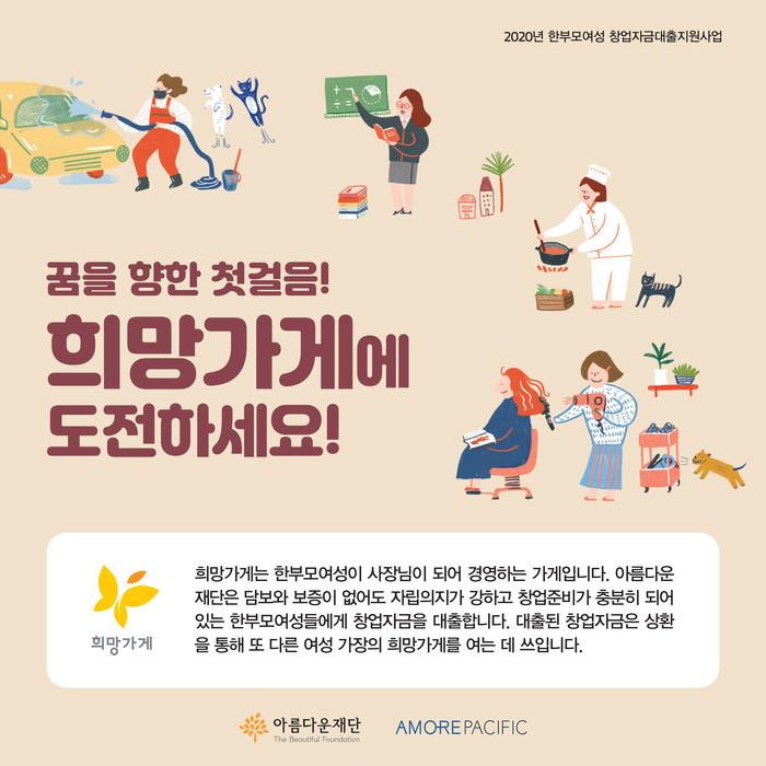[시민일보 = 황혜빈 기자] 아모레퍼시픽과 아름다운재단이 함께하는 한부모 여성 창업 대출 지원 사업 ‘희망가게’가 오는 3월6일까지 2020년도 1차 창업주를 공개 모집한다고 밝혔다.