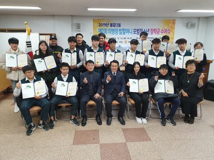 서울 은평구 불광2동 '의병장밥할머니호국기원제 추진위원회'는 최근 지역내 중·고등학교 모범청소년 16명에게 각 20만원 총 320만원의 장학금을 전달했다. 사진은 장학금 전달 후 기념촬영을 하고 있는 관계자와 학생들의 모습. (사진제공=은평구청)