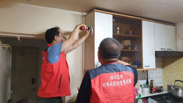 인천 동구 화수2동 지역사회보장협의체가 최근 인천중부의용소방대와 함께 지역내 취약계층을 대상으로 소화기와 화재감지기를 지원했다. 두 단체는 오는 12월까지 소화기 배부와 화재감지기를 설치한다. 사진은 화재감지기를 설치하고 있는 협의체 관계자들의 모습. (사진제공=동구청)