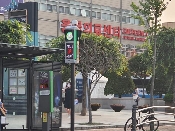 | ▲ 중앙대병원 앞 마을버스정류장(흑석동 224-8)에 설치된 ‘미세먼지 신호등’. (사진제공=동작구청) |