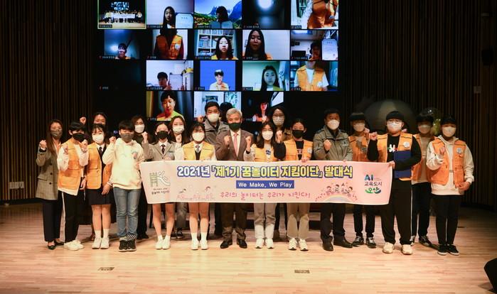 경기 오산시가 최근 '2021년 제1대 꿈놀이터 지킴단' 발대식을 온·오프라인으로 개최하고 단원들에게 위촉장 수여와 함께 꿈놀이터 지킴이단 운영방향 전달 및 활동 방안을 논의했다. 사진은 이날 발대식에 참석한 곽상욱 시장이 위촉장을 받은 꿈놀이터 지킴이 단원들과 기념촬영을 하는 모습. (사진제공=오산시청)