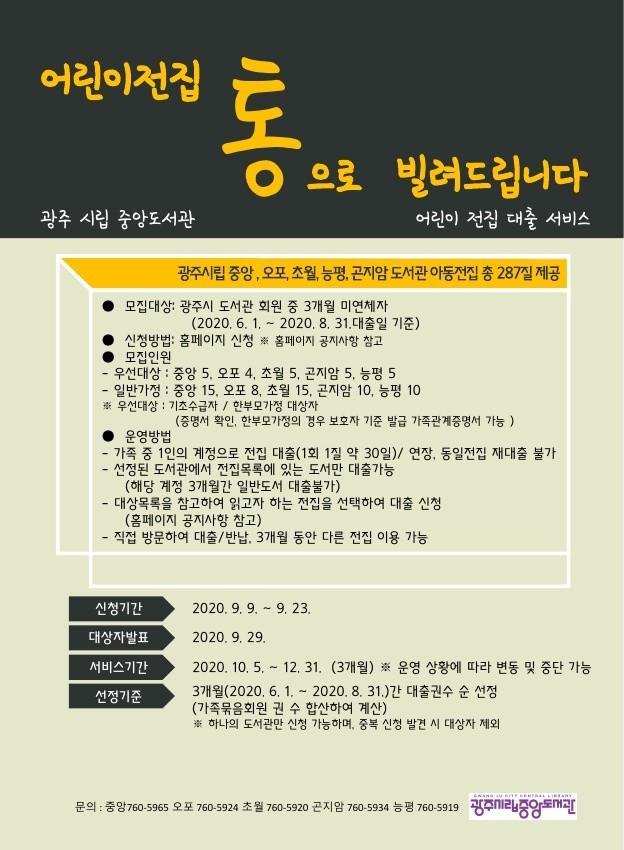시 관계자는 “외출이 부담스러운 요즘 밖에 나가지 않아도 가정에서 책과 함께 즐겁고 알찬 시간을 보낼 수 있는 어린이 전집 대출서비스의 많은 신청을 바란다”고 말했다.