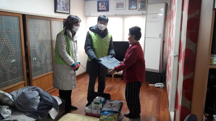 경기 광주시 도척면행정복지센터가 다가오는 설 명절을 맞아 28일 지역내 저소득층 160가구에 기부 받은 후원물품과 도척면에서 마련한 백미 160포(10kg), 휴지, 방역물품 등을 전달했다. 사진은 면 관계자들이 후원물품을 전달하고 안부를 묻고 있는 모습. (사진제공=광주시청)