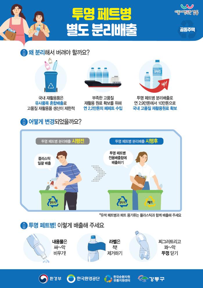 [시민일보 = 이대우 기자] 서울 강동구(구청장 이정훈)가 그동안 시범운영해 온 ‘투명 폐(廢)페트병 분리배출 요일제’가 오는 25일부터 지역내 아파트 256곳을 대상으로 전면 시행된다고 밝혔다.