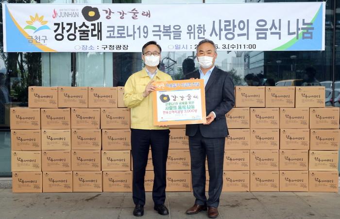 3일 외식문화기업 (주)전한의 대표브랜드 강강술래에서 지역 취약계층을 위해 한우소머리곰탕 3000봉(2400만원 상당)을 서울 금천구에 후원했다. 사진은 유성훈 구청장(왼쪽)과 노상환 (주)전한 대표이사가 기념촬영을 하는 모습. (사진제공=금천구청)