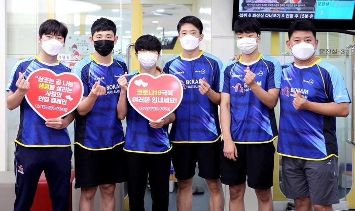 | ▲ 보람상조 실업탁구단 보람할렐루야 선수들과 오광헌 감독(오른쪽 첫번째)이 헌혈을 마치고 헌혈 독려 기념사진을 촬영하고 있다.(사진제공=보람상조) |