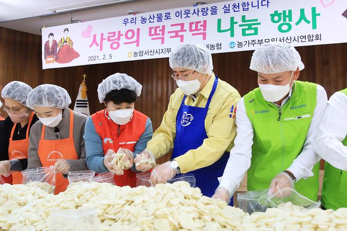맹정호 충남 서산시장이 5일 농가주부모임 서산시연합회 주관으로 농협중앙회서산시지부에서 열린 사랑의 떡국떡(800kg) 나눔행사에 참석했다. 이날 맹 시장은 취약농가 및 다문화가족 등 400여가구에 전달할 떡국떡(2kg)을 포장했다. 사진은 맹 시장(왼쪽 네 번째)이 떡국떡을 포장하는 모습. (사진제공=서산시청)