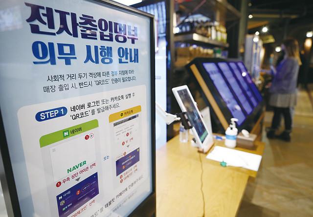 새로운 ‘사회적 거리두기’ 1단계 시행 이틀째인 8일 서울의 한 쇼핑몰 내 음식점 앞 전자출입명부 의무 시행 관련 안내문.