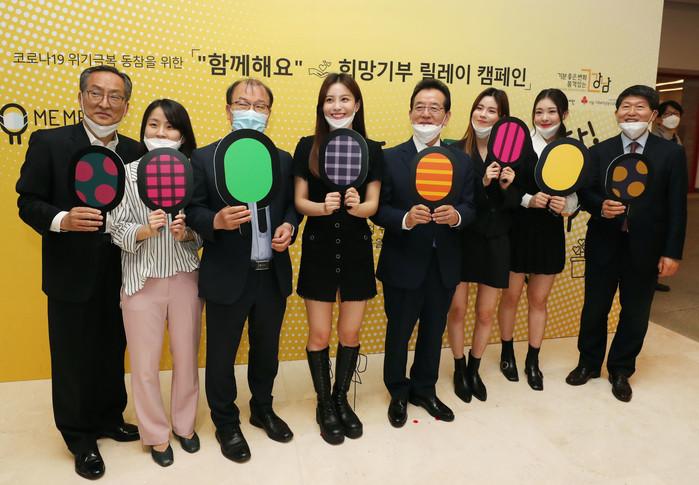 서울 강남구가 오는 7월4일까지 구청로비, 코엑스에 '함께해요 희망기부 릴레이 캠페인' 기부존을 설치·운영한다. 이렇게 모금된 기부금은 코로나19로 피해를 입은 지역 소상공인의 상품 구매 및 취약계층 지원에 사용될 예정이다. 사진은 캠페인에 참여한 아이돌그룹 ‘네온펀치’와 기념 사진을 찍고 있는 정순균 구청장(오른쪽 네 번째)과 관계자들의 모습. (사진제공=강남구청)