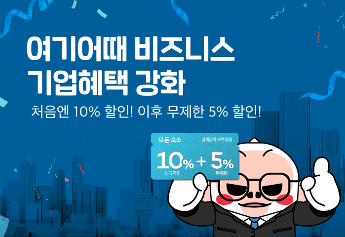 [시민일보 = 고수현 기자] 국내 대표 종합숙박·액티비티 예약서비스 여기어때(대표 최문석)가 '여기어때 비즈니스' 가입 기업 혜택을 강화했다.