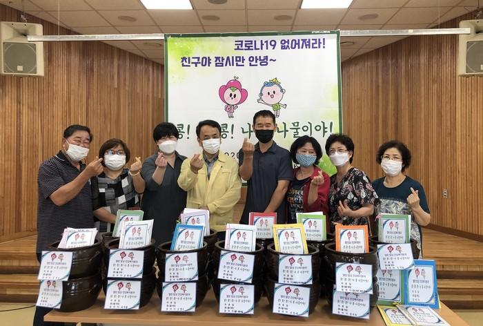 서울 광진구 구의3동 주민센터 주민자치회가 최근 중장년 1인 가구·한부모가정 등 25가구에 집에서 직접 재배할 수 있는 콩나물 시루를 전달했다. 사진은 전달식에서 관계자들이 기념촬영을 하는 모습. (사진제공=광진구청)