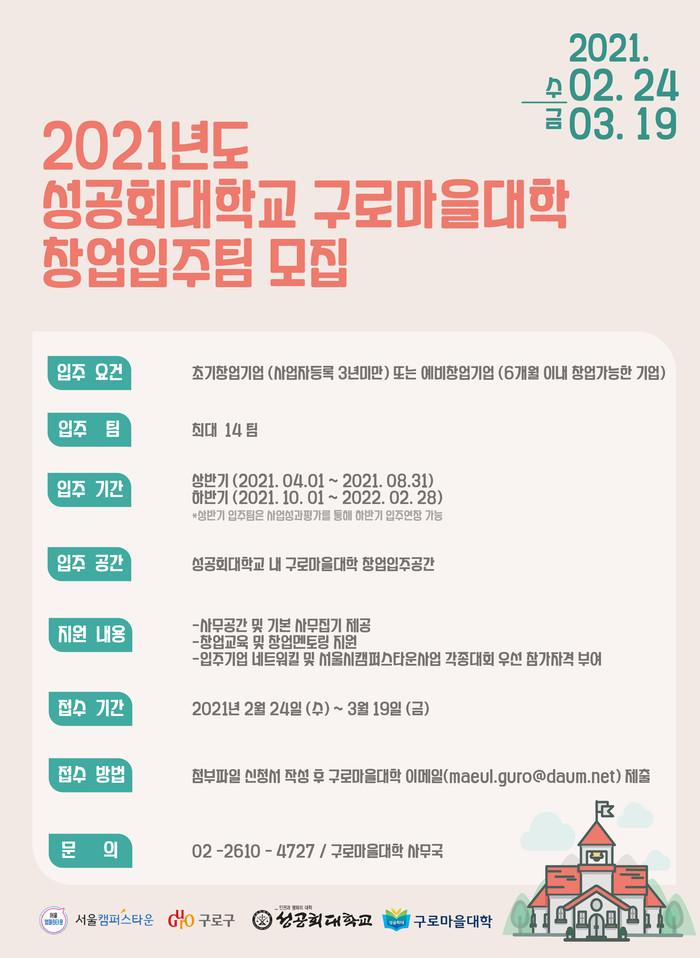 | ▲ 2021년도 성공회대 구로마을대학 지역거점 창업입주팀 모집 홍보 포스터. |