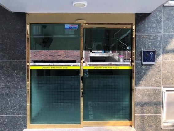 ▲ 안심거울(미러시트)이 부착된 지역내 건물 현관 유리문. (사진제공=서대문구청) |