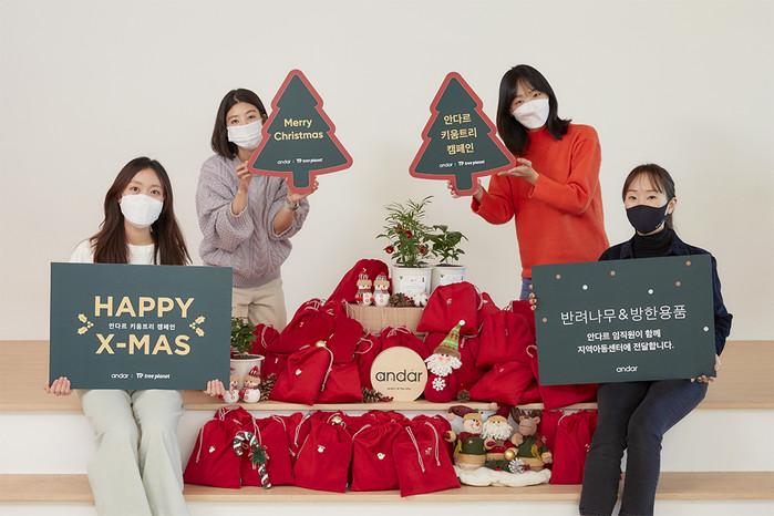 안다르는 지난 22일 초록우산어린이재단 의정부지역아동센터 23곳에 반려나무 140그루와 안다르 방한용품인 리업 웜 비니, 기모 양말 280개를 별도 제작한 크리스마스 파우치에 담아 선물했다.