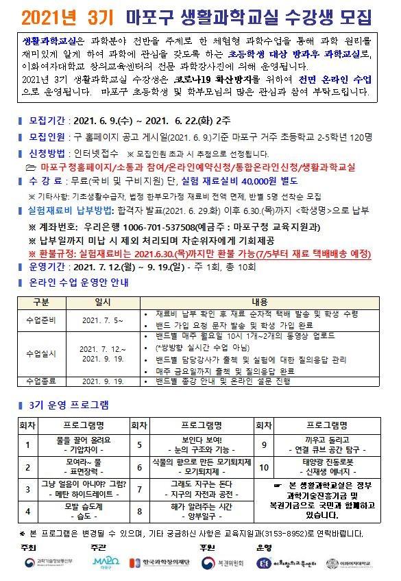 [시민일보 = 홍덕표 기자] 서울 마포구(구청장 유동균)는 지역내 2~5학년 초등학생을 대상으로 운영하는 '2021년 3기 생활과학교실' 참가자를 오는 22일까지 모집한다고 밝혔다.