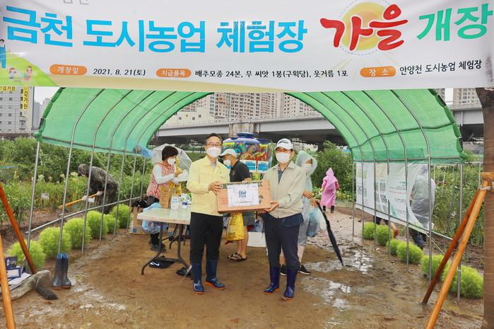 금천구는 최근 안양천 둔치에 있는 금천 도시농업체험장을 개장했다. 구는 이용 주민들에게 텃밭 구획당 배추모종 24본·웃거름 1봉 등을 지급했으며, 도시농업전문가를 초빙해 모종 심는 방법 등을 교육했다. 사진은 개장식에서 유성훈 구청장(왼쪽)이 관악농협으로부터 무·상추 씨앗을 제공받고 기념촬영을 하는 모습. (사진제공=금천구청)
