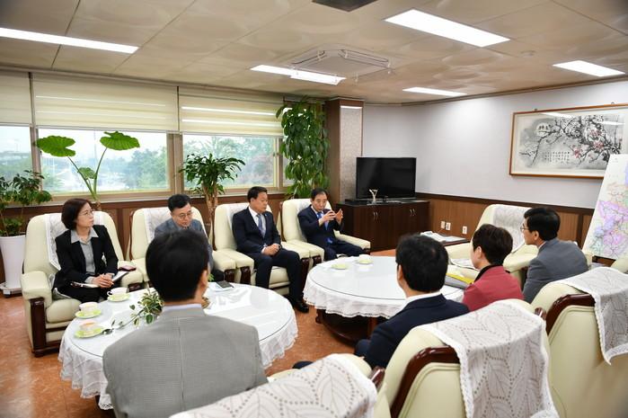경기 포천시가 15일 스승의 날을 맞아 포천교육지원청을 방문해 심춘보 교육장과 간담회를 개최했다. 사진은 이날 간담회에 참석한 박윤국 시장이 심 교육장 및 관계자들과 의견을 나누고 있는 모습. (사진제공=포천시청)
