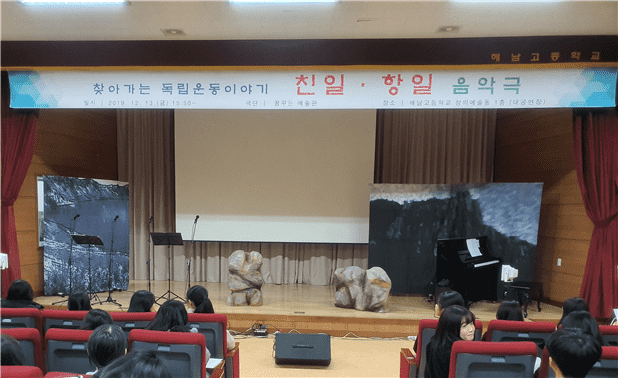 해남고등학교는 3·1운동 100주년과 광복 제74주년을 기념, 민족문제연구소에서 주관하는‘친일·항일 음악극’을 초청, 전교생과 전교직원이 공연을 관람하며 올바른 역사 인식을 고취시켰다.