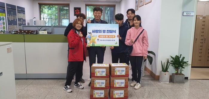 경기 안성시 공도읍사무소는 24일 공도읍 꿈드림센터와 연계해 지역내 청소년과 홀몸노인에게 제공할 '사랑의 빵 전달식'을 열었다. 이날 꿈드림센터는 정성스럽게 만든 빵 300여개를 공도읍사무소에 전달했으며, 전달된 빵은 지역내 어려운 이웃 30가구에 배부됐다. 사진은 전달식에 참여한 관계자들이 기념촬영을 하는 모습.(사진제공=안성시청)
