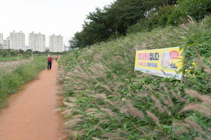 서울 양천구는 안양천 인근의 노후한 콘크리트 제방사면을 정비해 걷기 편한 산책로로 정비해 주민들에게 제공했다. 사진은 지난 20일 구 주민이 안양천생태공원에 조성된 황톳길을 맨발로 걷고 있는 모습.(사지제공=양천구청)