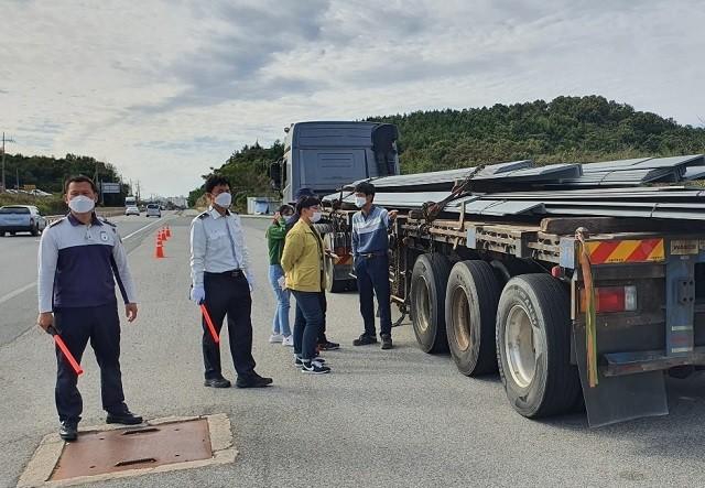 | ▲ 영암군-영암경찰서-한국교통안전공단과 지난 15일 영암군 삼호읍 일원에서 화물자동차 법규위반행위 합동 단속 실시 / 영암군 제공 |