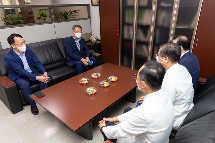 조청식 경기 수원시 제1부시장은 지난 28~29일 수원 예방접종센터 운영을 지원해주고 있는 아주대학교병원, 가톨릭대학교 성빈센트병원, 동수원병원과 수원시자원봉사센터를 방문해 관계자들과 면담했다. 사진은 조 부시장(왼쪽)이 아주대학교병원 관계자들과 면담하고 있는 모습. (사진제공=수원시청)
