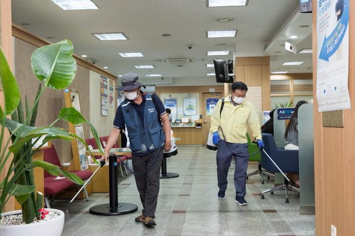 양천구는 수도권의 사회적 거리두기 2.5단계가 오는 13일까지 연장됨에 따라 코로나19의 확산을 방지하기 위해 방역소독에 나섰다. 사진은 구 관계자들이 8일 신월6동에 위치한 은행 내부 시설을 소독하고 있는 모습. (사진제공=양천구청)