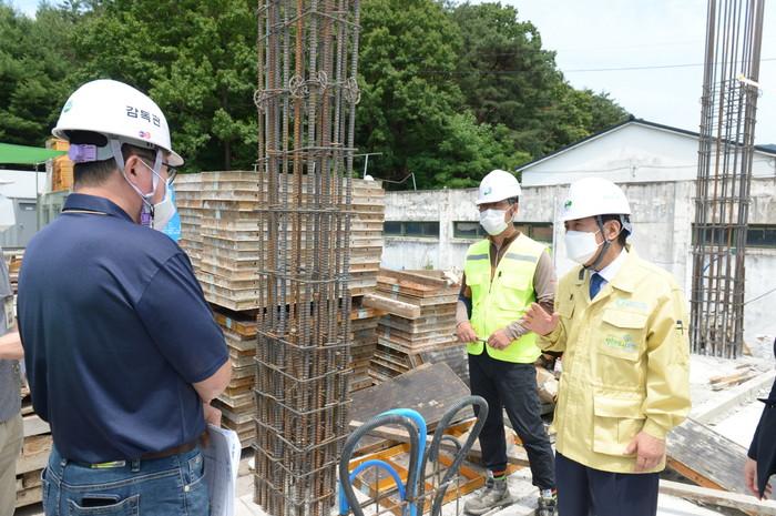 박윤국 경기 포천시장은 14일 우기를 대비해 포천대광지역주택조합 APT 등 대형공사장 3곳을 방문해 현장내 절·성토면 등 붕괴취약지역에 대한 조치 여부와 작업순서·공법 등 안전상황을 점검하고 공사 관계자들에게 안전수칙 준수를 당부했다. 사진은 박 시장(오른쪽)이 관계자들과 현장을 둘러보고 있는 모습. (사진제공=포천시청)
