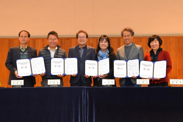 ▲ 협약식에 참석한 전병화 서울시 중부교육지원청 교육장, 서양호 중구청장, 조희연 서울시 교육감, 나수연 서울광희초등학교장, 이문수 서울남산초등학교장, 윤옥선 서울청구초등학교장(왼쪽부터)이 기념촬영을 하고 있다. (사진제공=중구청) |