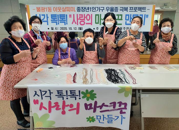 서울 은평구 불광1동이 지난 12일 고독사 예방 및 사회적 고립가구 안전망 확충을 위한 주민관계망 형성 ‘히히낙낙(Knock2)’ 사업으로, 중장년 1인가구 우울증 극복 프로젝트 '고독사 OUT 사랑의 물품 만들기'를 진행했다. 사진은 마스크끈 만들기에 참여한 동 이웃살피미들이 기념촬영을 하는 모습. (사진제공=은평구청)