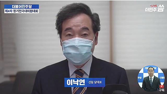 지난 29일 오후 서울 여의도 더불어민주당 당사에서 열린 ‘제4차 전국대의원대회’에서 신임 당대표로 선출된 이낙연 의원이 자택에서 수락연설을 하고 있다. 이번 전당대회는 민주당 유튜브 채널 ‘씀TV’를 통해 온택트(온라인을 통한 비대면)방식으로 진행된다.