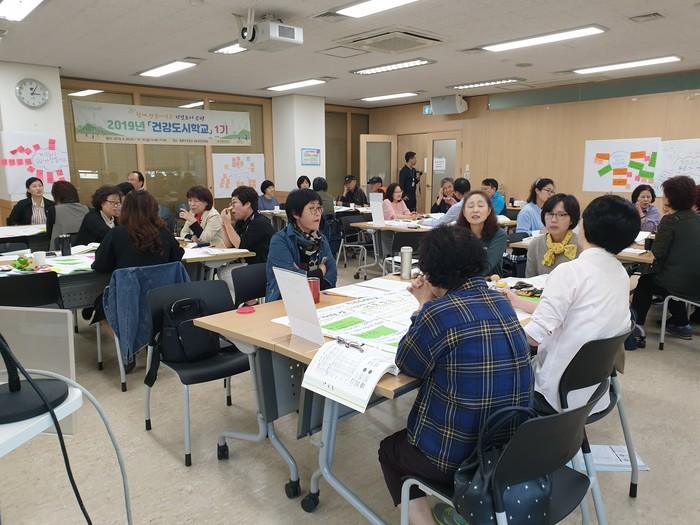 최근 서울 은평구가 건강도시 정책에 참여하며 다양한 의견을 제시할 ‘건강도시 활동가’를 양성하는 ‘건강도시학교’(1기) 프로그램을 종료하고 첫 수료생을 배출했다. 사진은 30명의 수료생이 프로그램 마지막날 수업을 받고 있는 모습. (사진제공=은평구청)