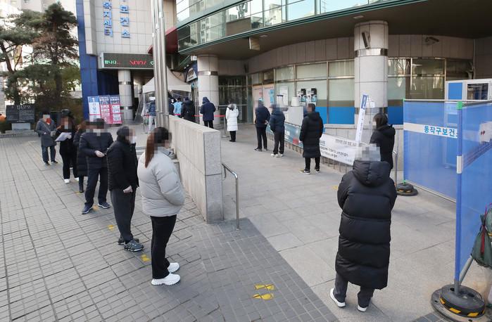절기상 소한인 5일 오후 서울 동작구보건소에 마련된 임시 선별진료소를 찾은 시민들이 검체 검사 순서를 기다리고 있다.