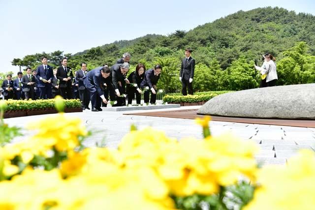 더불어민주당 김태년 원내대표(왼쪽부터), 노영민 대통령 비서실장, 정의당 심상정 대표, 미래통합당 주호영 원내대표가 23일 오전 경남 김해시 봉하마을에서 열린 노무현 전 대통령 서거 11주기 추도식에 참석해 헌화하고 있다.