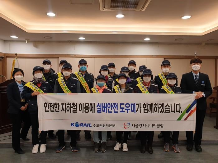 한국철도(코레일) 수도권광역본부가 최근 한국노인인력개발원, 서울강서시니어클럽과 함께 ‘노인일자리 창출 시범사업’을 위한 업무협약을 체결했다. 사진은 시범사업의 일환으로 선출된 실버안전 도우미들이 기념촬영을 하고 있는 모습. (사진제공=코레일)