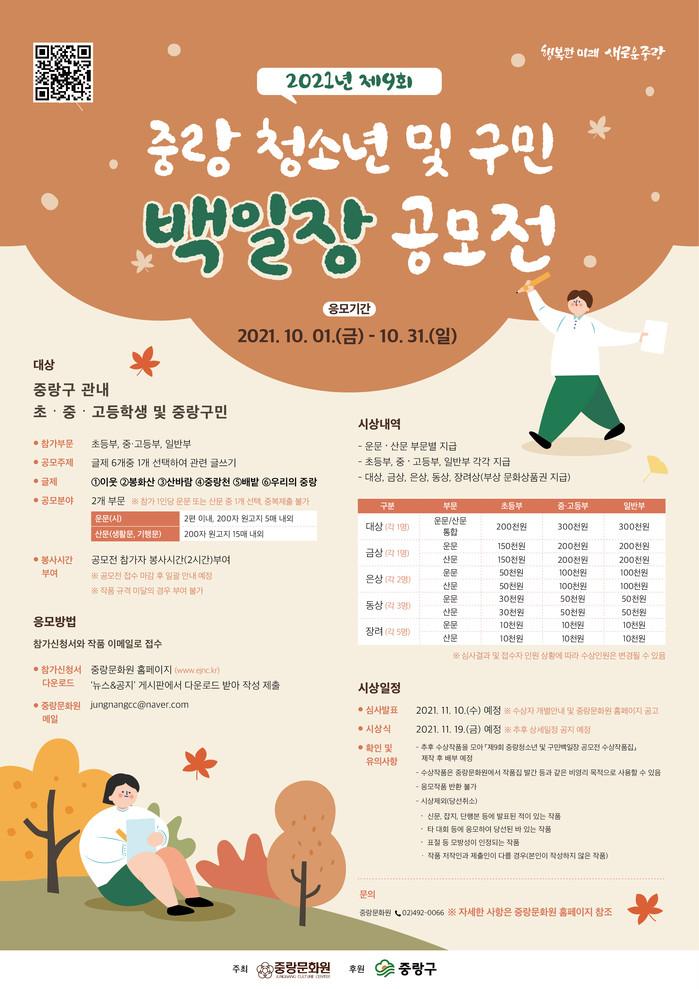 [시민일보 = 여영준 기자] 서울 중랑구(구청장 류경기)가 오는 31일까지 ‘제9회 중랑 청소년 및 구민 백일장 공모전’을 개최한다고 밝혔다.