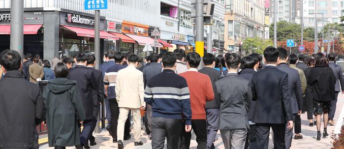단계적 일상회복(위드 코로나) 시행 첫 날인 1일 세종시 정부세종청사 공무원들이 점심 식사를 위해 외부식당 등으로 이동하고 있다.