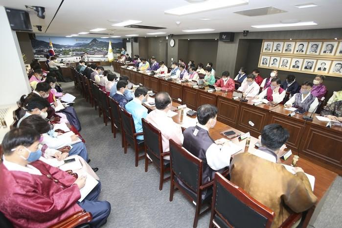 종로구는 26일 구청장 등 간부들이 코로나를 이겨내고 일상을 회복하자는 의미에서 한복을 입고 참석하는 정례간부회의를 개최했다. 사진은 김영종 구청장과 간부들이 모두 한복을 입고 회의를 하고 있는 모습. (사진제공=종로구청)