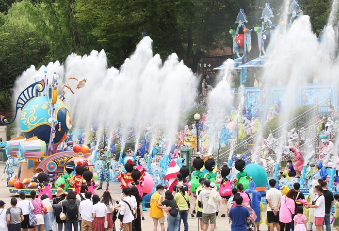 22일 오후 경기도 용인시 에버랜드를 찾은 시민들이 '슈팅 워터 펀' 공연을 즐기고 있다.