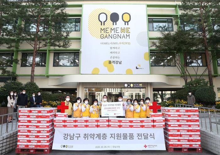 서울 강남구는 28일 '강남구 취약계층 지원물품 전달식'을 열고 약 1800만원 상당의 지원물품을 지역내 저소득 취약계층에 전달했다. 사진은 전달식에 참여한 정순균 구청장(왼쪽에서 다섯 번째)과 관계자들이 기념촬영을 하고 있는 모습. (사진제공=강남구청)